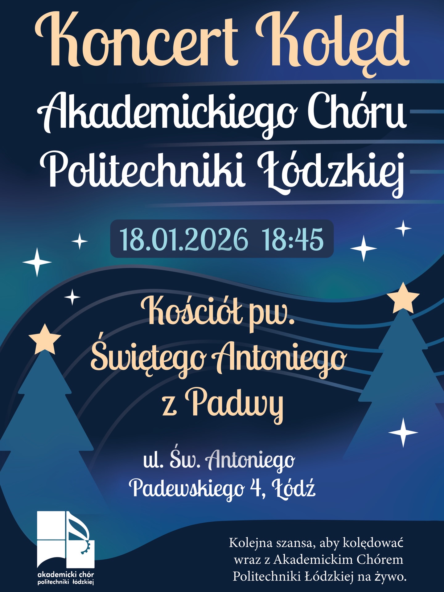 Tego wieczoru świąteczne melodie zabrzmią w wykonaniu Akademickiego Chóru Politechniki Łódzkiej pod batutą dyrygenta Kamila Chałupnika, którym towarzyszyć będą soliści Katarzyna Zając-Caban i Bartosz Szulc, a subtelny, pełen blasku akompaniament zapewni Grażyna Malec-Przedlacka.